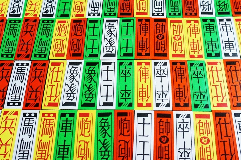 牌の構成は、四色(白、黄、赤、緑)の「帥、将、仕、士、相、象、俥、車、傌、馬、炮、砲、兵、卒」の牌が、それぞれ4枚ずつ、合計112枚となっている。